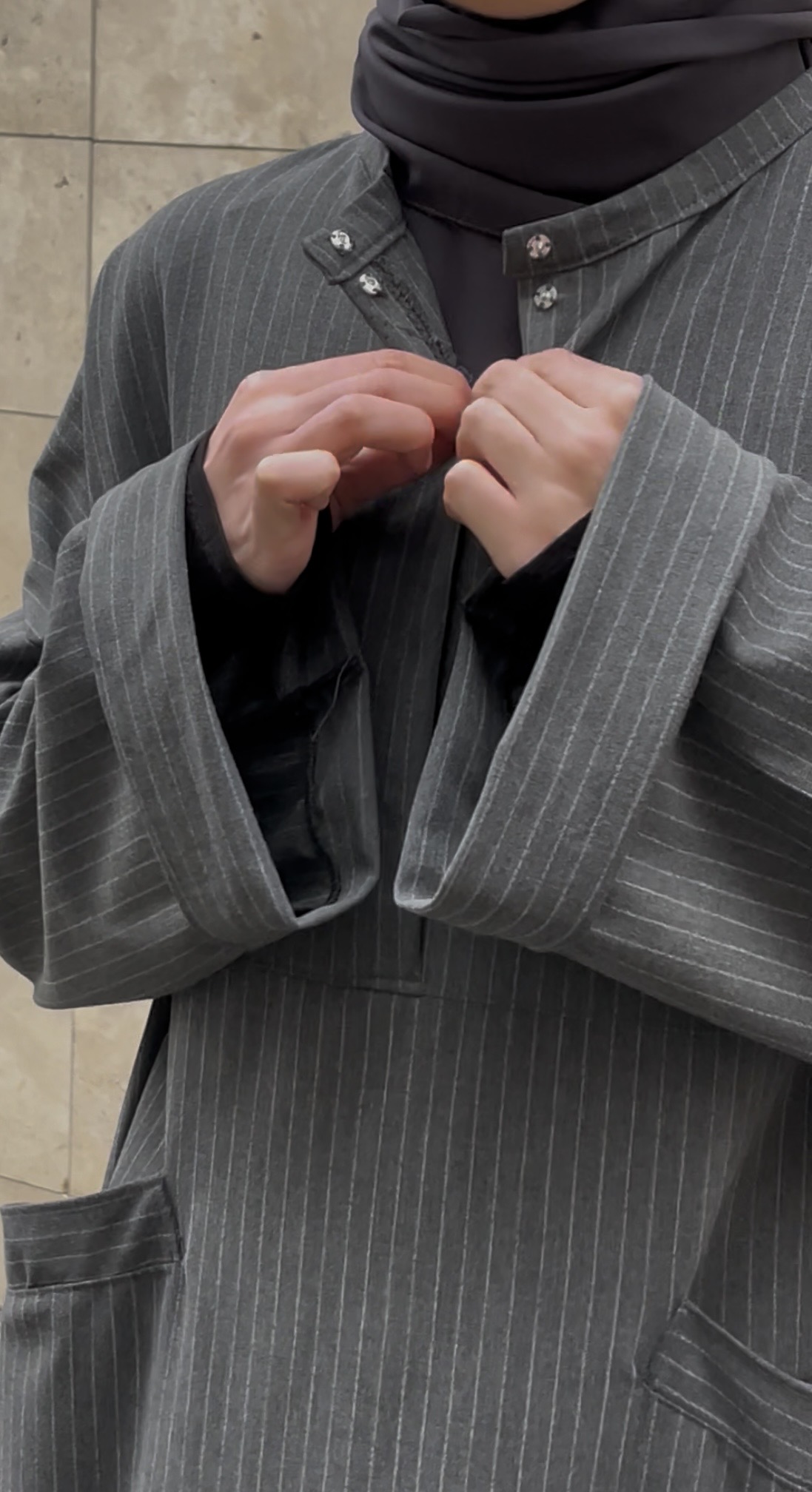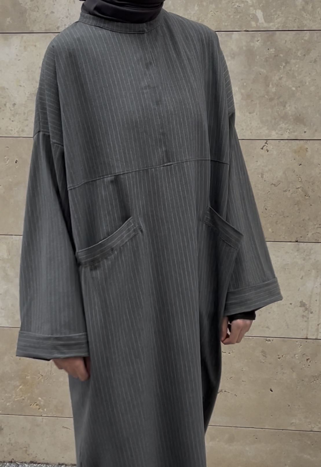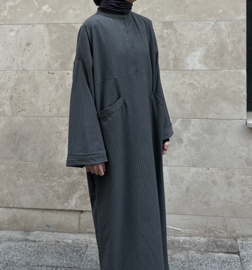 36-42 beden uyumludur. Gabardin kumaştan yapılmıştır . Boyu 140 cm. Bahar ve kış mevsimine uygundur. Gizli çıtçıt ve cep detaylıdır. Gri üzerine beyaz çizgilidir. Renkleri yakında gelecektir.